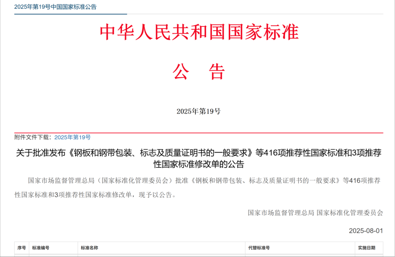 2025年8月1日,国家市场监督管理总局、国家标准化管理委员会批准发布416项推荐性国家标准和3项推荐性国家标准修改单,其中包括由全国物流标准化技术委员会提出并归口的《平托盘 性能要求和试验选择》(GB/T 4995-2025)、《平托盘 试验方法》(GB/T 4996-2025)、《塑料平托盘》(GB/T 15234-2025)、《一次性托盘》(GB/T 20077-2025)、《物流中心作业通用规范》(GB/T 22126-2025)、《物流园区统计指标体系》(GB/T 30337-2025)、《水产品冷链物流服务规范》(GB/T 31080-2025)和《医药产品冷链物流温控设施设备验证 性能确认技术规范》(GB/T 34399-2025)8项国家标准。