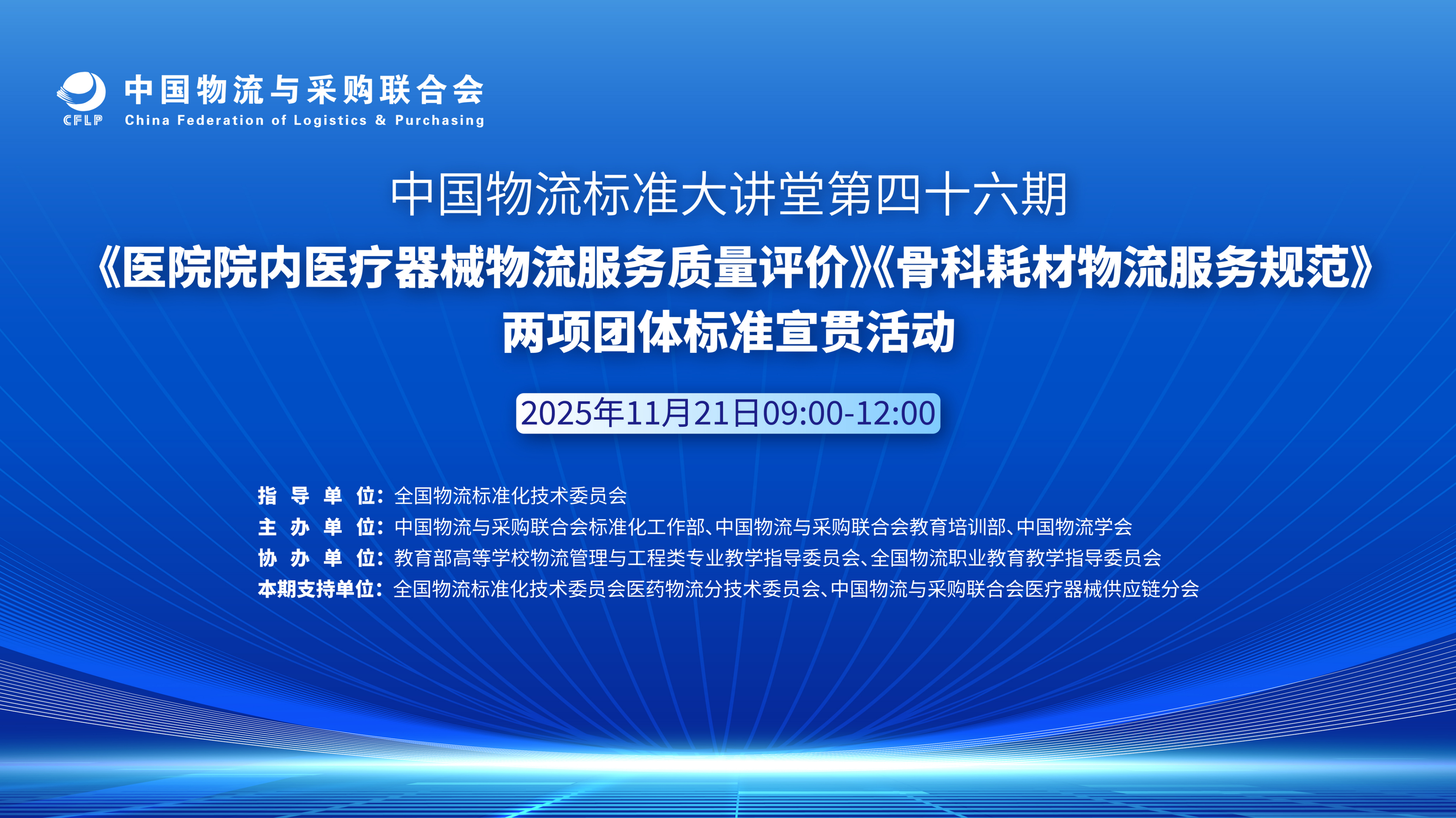 2025年11月21日,在全国物流标准化技术委员会的指导下,中国物流与采购联合会标准化工作部、中国物流与采购联合会教育培训部和中国物流学会共同主办了“中国物流标准大讲堂”第46期活动,对《医院院内医疗器械物流服务质量评价》(T/CFLP 0078-2025)、《骨科耗材物流服务规范》(T/CFLP 0079-2025)两项团体标准进行宣贯。活动通过线下与线上结合的形式举行,线下会场设在上海市,80余人参加;线上在“中物联教育培训”“中国物流学会”和“中物联医疗器械”微信视频号以及“中物联教育培训”小鹅通直播间同步直播,3000余人次参加。