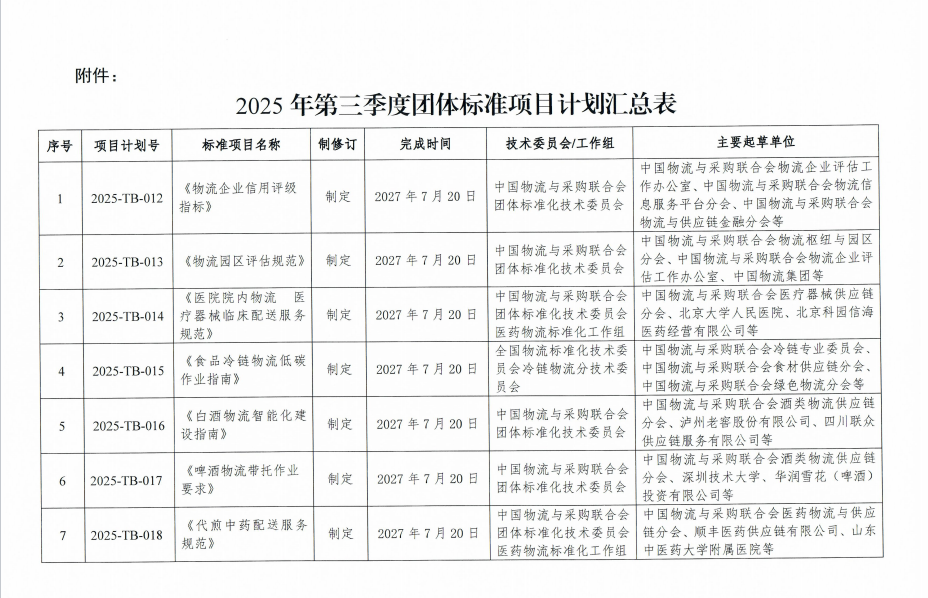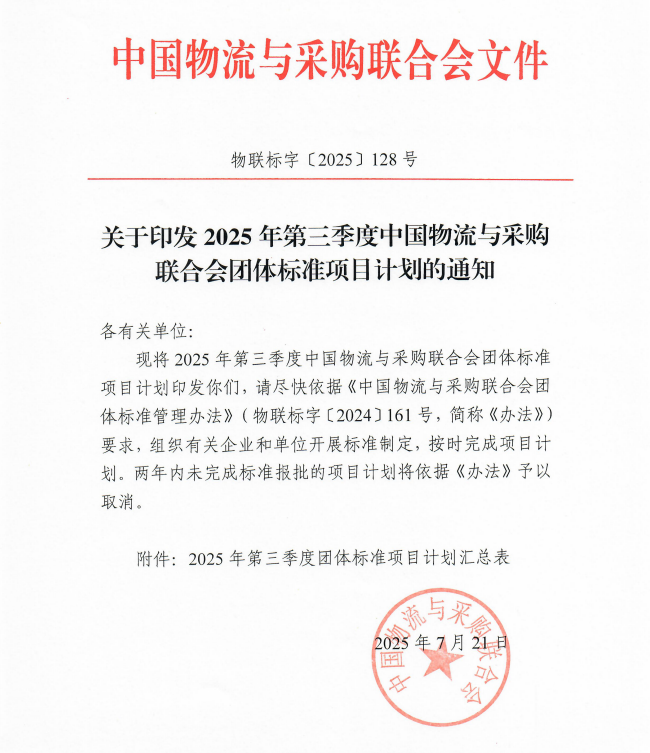中物联印发2025年第三季度团体标准项目计划