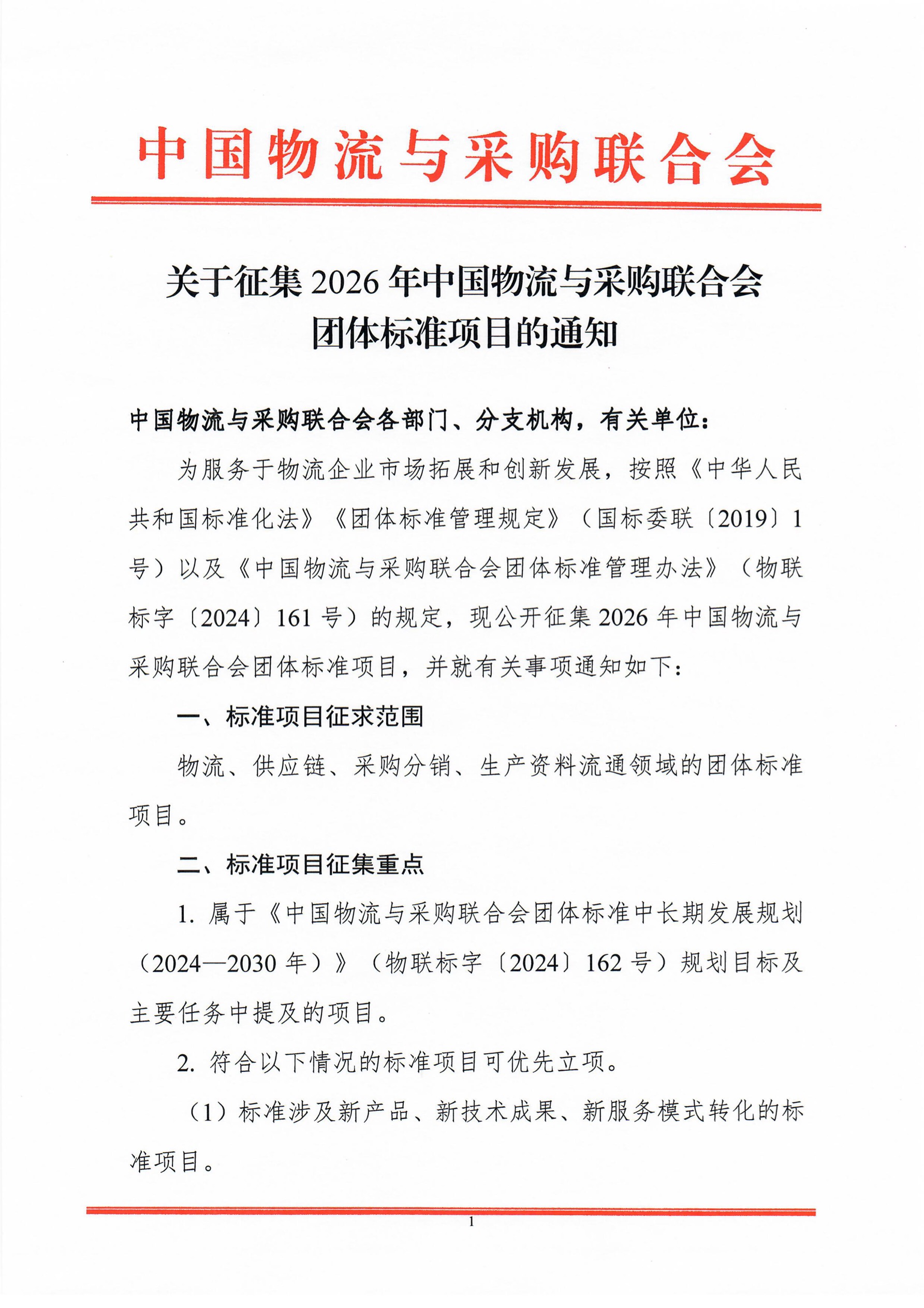关于征集2026年中国物流与采购联合会团体标准项目计划的通知