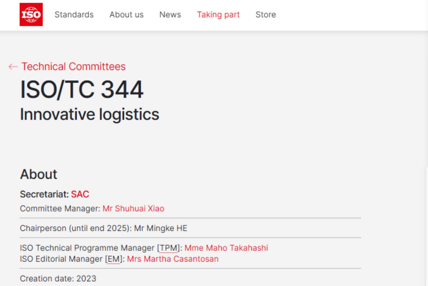 国际标准化组织(International Organization for Standardization,简称ISO)是由各国标准化团体组成的世界性的联合会,制定国际标准工作通常由ISO的技术委员会来完成。新批准成立的创新物流标准化技术委员会,英文名称:Technical Committee on Innovative Logistics,编号ISO/TC 344,秘书处设在中国,秘书处工作由中国物流与采购联合会承办,ISO/TC 344第一任主席由中物联推荐北京工商大学何明珂教授担任,秘书处经理由中物联国际合作部主任肖书怀担任。