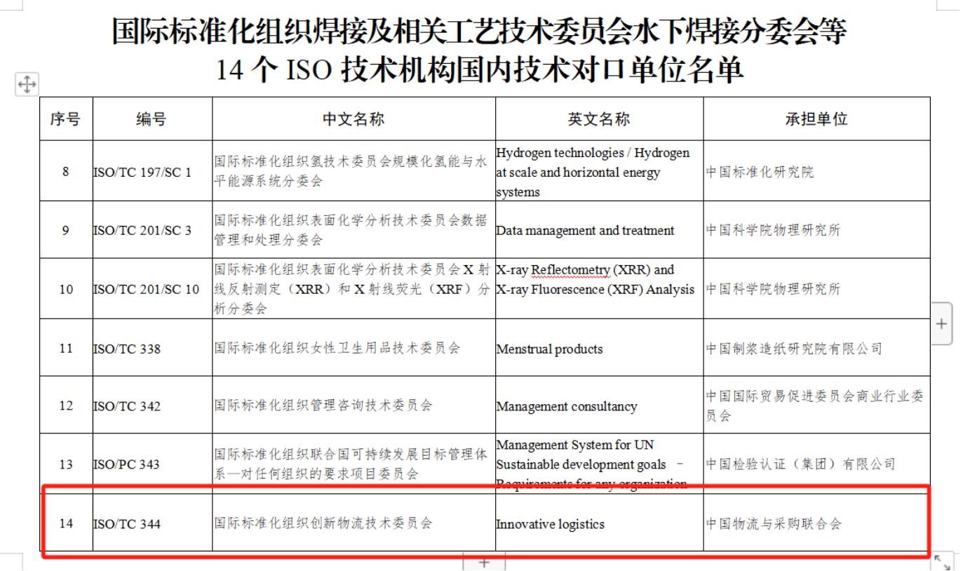 2023年12月18日,经国家标准化管理委员会批准,同意中国物流与采购联合会(以下简称“中物联”)承担国际标准化组织ISO/TC344(创新物流技术委员会)的国内技术对口单位工作(见公告)。